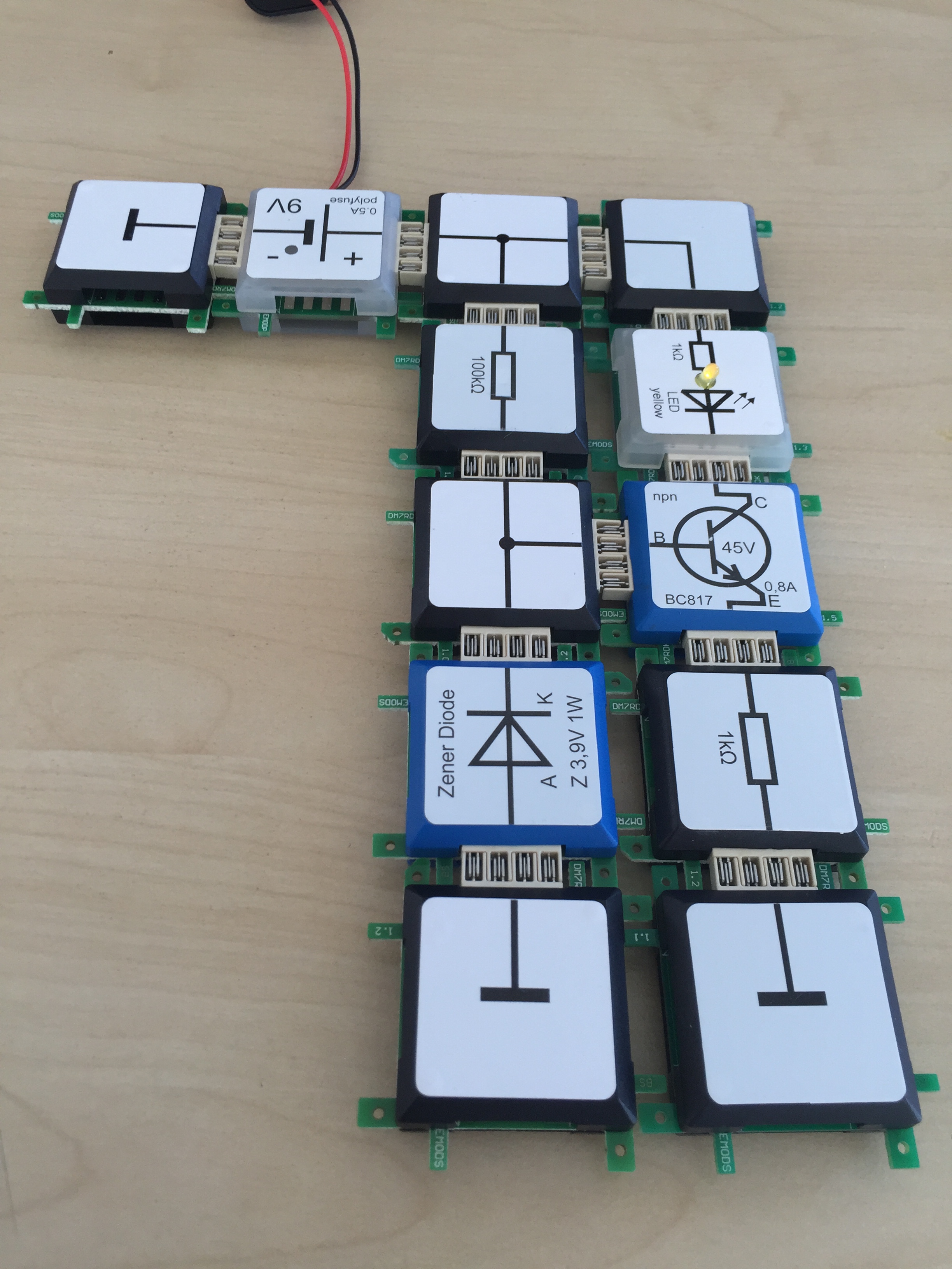 Since the voltage drop across diodes (also LEDs) is constant, they are controlled by the current. Usually LEDs are driven with a constrant current to maintain a constant intensity. To stabilize the current we use a small circuit with a transistor and a so called zener diode. The zener diode can be operated in reverse direction, and has a so called breakdown voltage. This zener voltage is 3.9V for our zener diode. Now with the 100k Ohm in series we have a voltage of 3.9V at the base of the transistor. Across the base to emiiter we have 0.7V drop. This results in 3.2V at the emitter. Now we get into business. The 3.2V is also accross the 1k Ohm resistor at the emitter towards ground. A small current ows into the base (dened by the 100 kOhm resistor), its enough to switch on the transistor. Therefore most of the emitter current ows into the collector. That means the current into the LED is around 3.2 mA. It is important to ensure that the zener diode is reverse biased. It is named after the Zener effect, that was described by american scientist Clarence Zener for the rst time. He found out, that electrons can tunnel through the semiconductor layers in the revers direction, when their enhancement with positive and negative charge carriers is very high. Zener diodes have aspecic Z-voltage, depending on their production methode. Our zener diode has a Zener voltage of 3.9 volts. The next experiment 9.10 deals with their constancy.