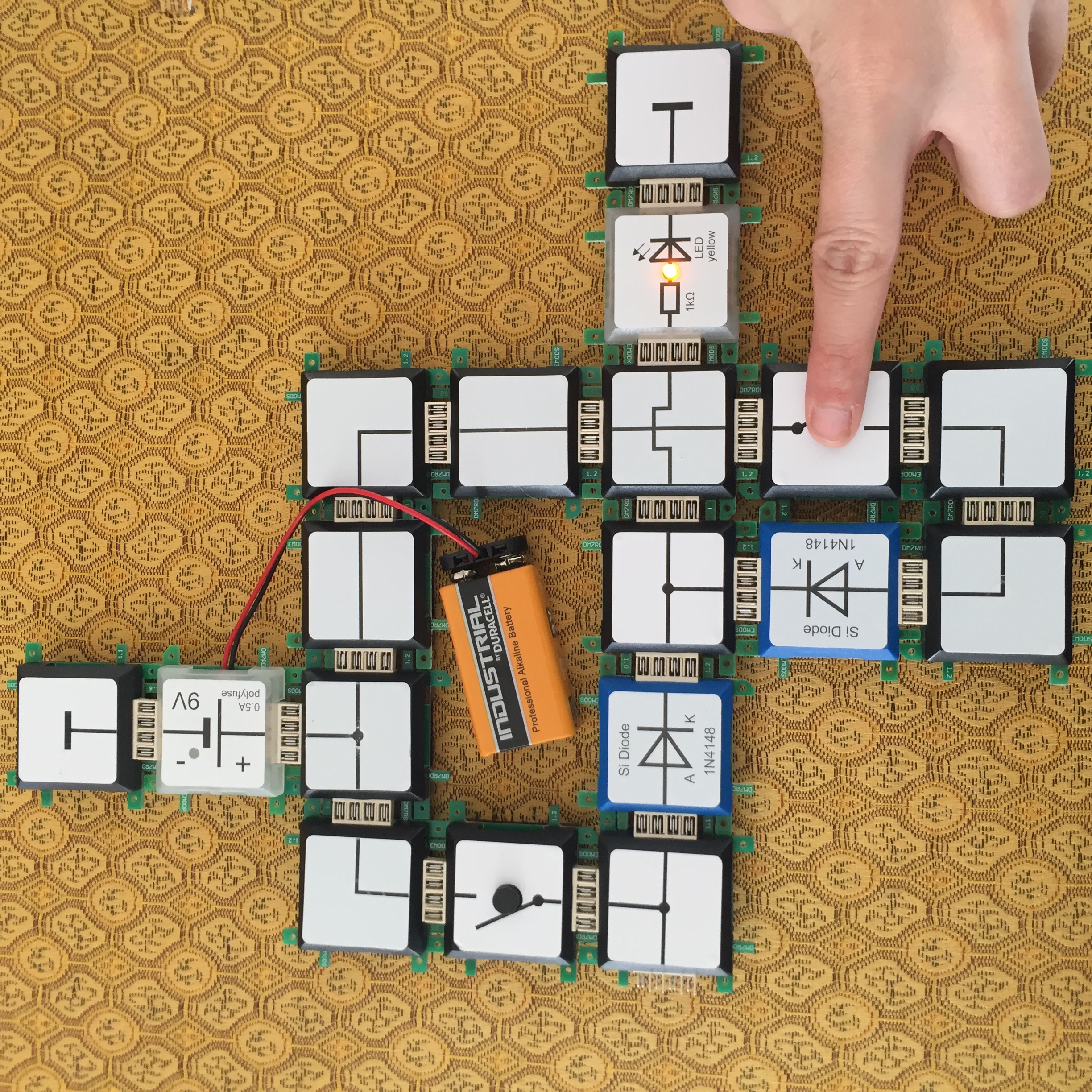 Its also easy to implement an OR circuit. This is even easier to understand, than the previous AND circuit. We just need to move a few bricks. These circuits can be problematic, because the output voltage (level) are no longer compatible, when combined with additional follow up logic functions. Additional transistors can solve the problem. They amplify the output signal again and a DTL (Diode-Transistor-Logic) will result. In the following circuit it does not matter which push button is pressed. The red LED lights up always when one or the other or both buttons are pressed. If no button is pressed, the LED is off. This is a simple OR function.